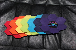 So I did manage to get one of each color completed for my post today. I had all these great ideas about taking a photo of them on the grass (which I freshly mowed yesterday) under the bright sunlight. And then the day got in the way. It was Tim Horton's Camp day, so I went there a few times to get coffee and help them raise money to send kids to Camp. And I played with my beasty boy, see part one for photos. And I went to Chapters to see if they had any good books on EPP. They didn't have a single book! Like WTF? A whole row for knitting, another for crochet and very very little for hand stitching. Disappointed I was. (If anyone knows any good books please comment and let me know. I would love to get one or two.)